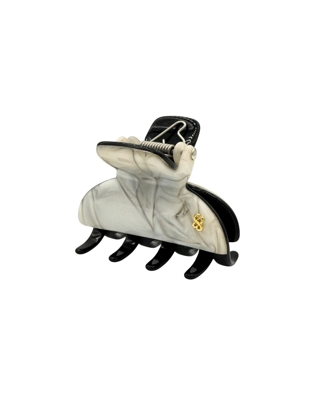 Prendedor de cabelo Bianca Accessory® Madrid Mantle Grande com 4 dentes de cada lado e fixação firme. Feito artesanalmente em acrílico premium, com mola patenteada em aço inox e monograma banhado a ouro.
